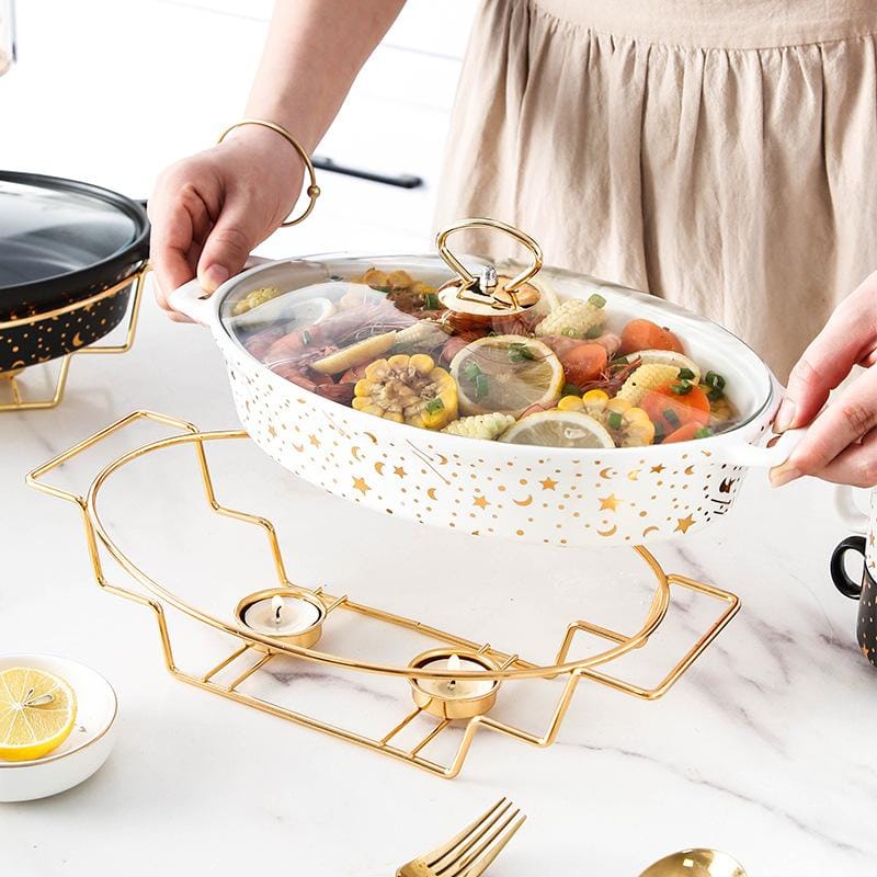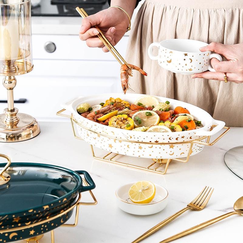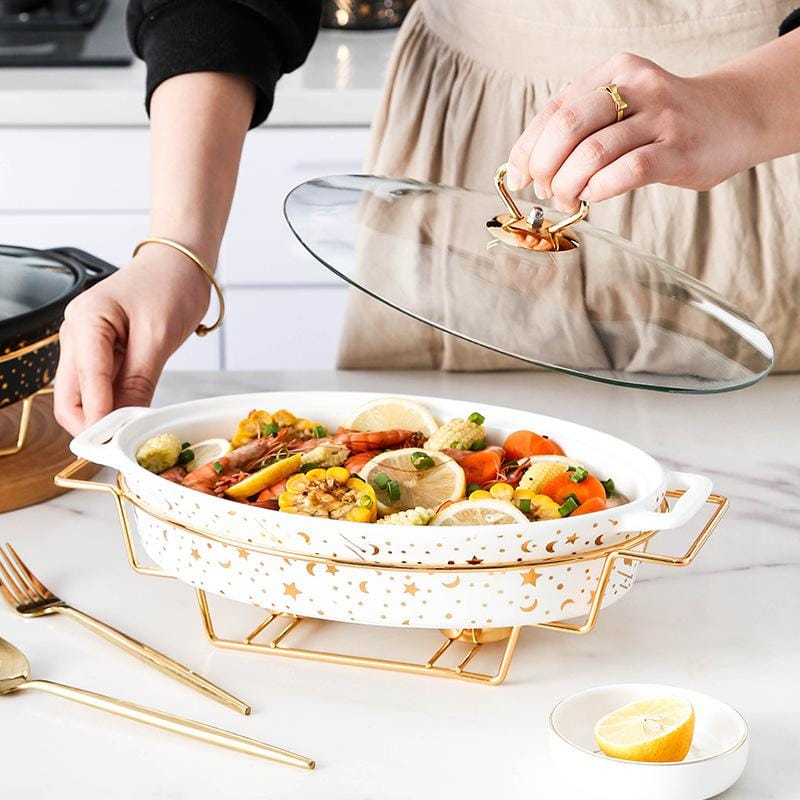 Eco-friendly gold marble ceramic casserole dish with glass lid, supplied by a reliable manufacturer, enhances restaurant and bulk wholesaler kitchen operations.