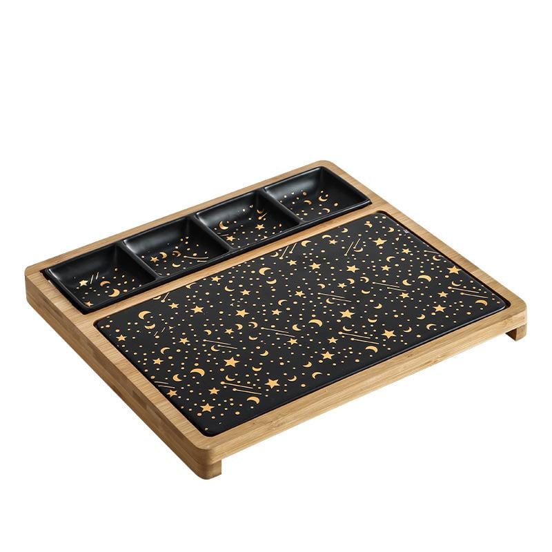 Unique star moon design ceramic steak plate with bamboo base, crafted by a trusted supplier, enhances restaurant and bulk wholesaler dining.