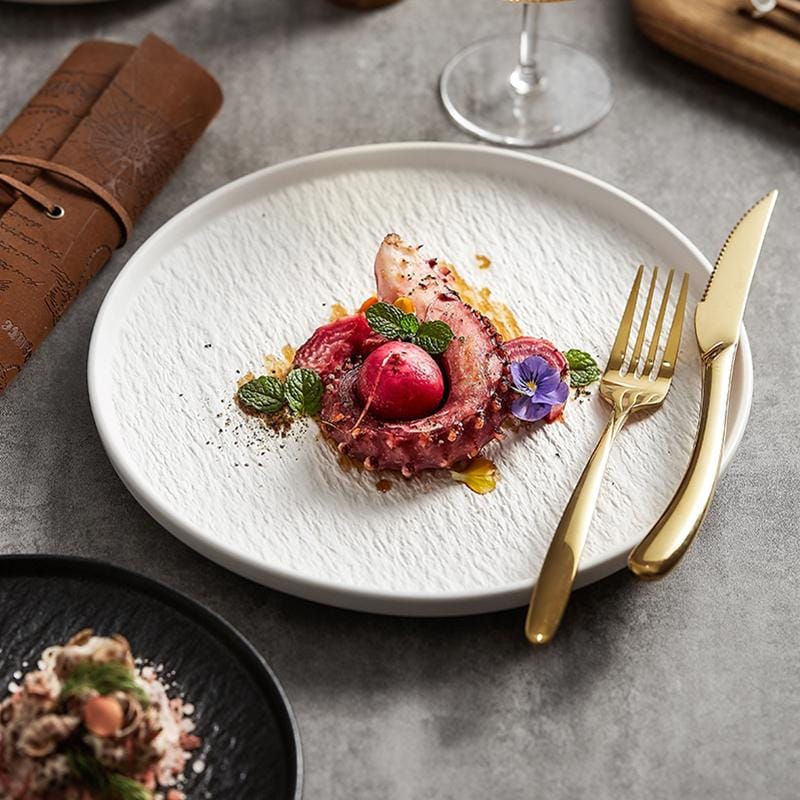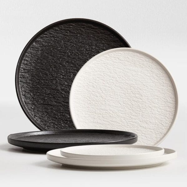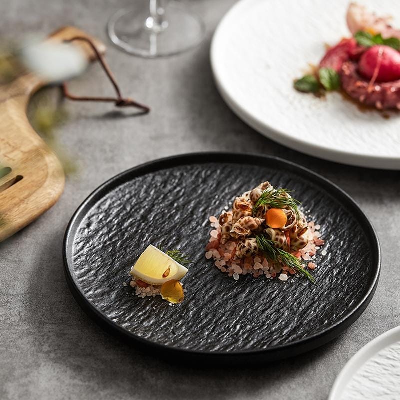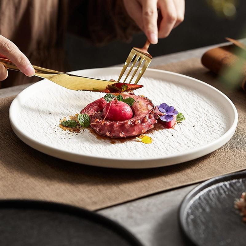 Durable stone texture ceramic dinner plate in 8.5/10.5/12 inches, crafted by a trusted supplier, serves hotels and bulk wholesalers with customizable design.